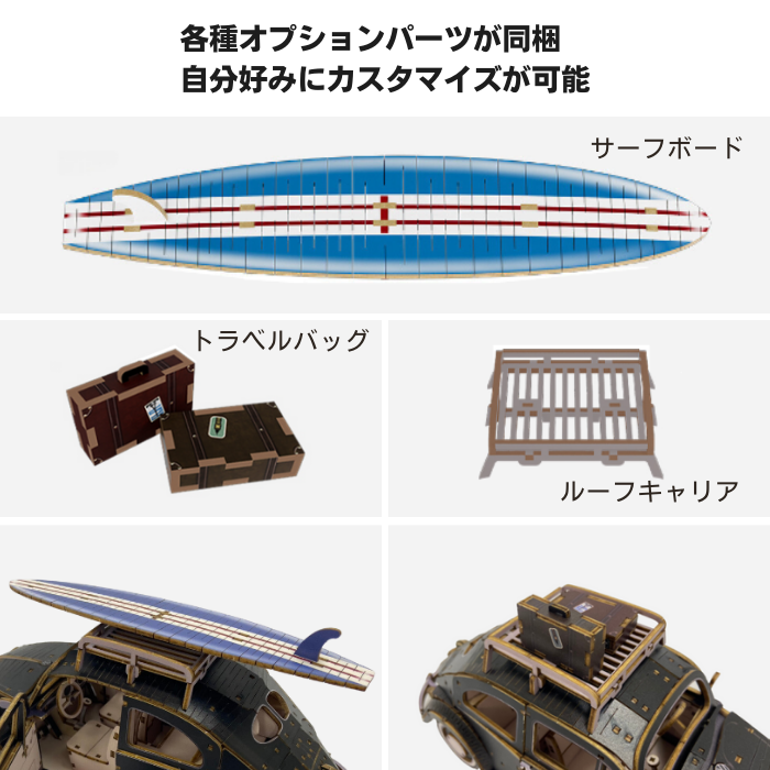 After completion, the doors, hood, and engine can be opened and closed. The engine and spare tire are also included. Various optional parts are included in the package, allowing you to customize it to your own needs.